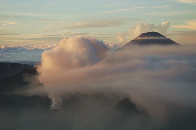vorn links rauchend: Gunung Bromo, hinten rechts: Gunung Semeru