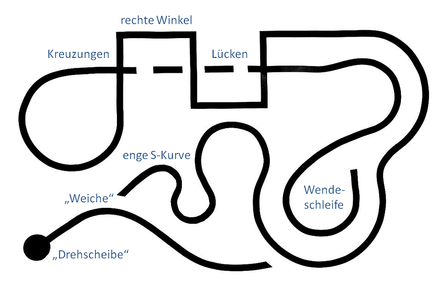 Den Kurs für den Line Follower habe ich aus schwarzen PVC-Isolierband von 15 mm Breite auf weißen Bastelkarton geklebt. Dieser Kurs enthält einige Herausforderungen (siehe Bild), denen sich meine Software zu stellen hatte.