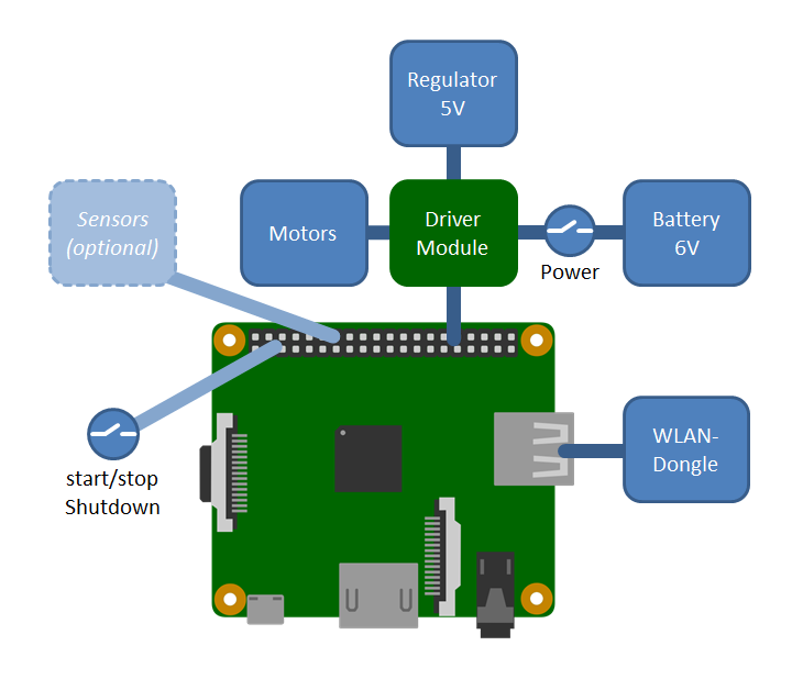 Herzstück des Roboters ist der Einplatinencomputer Raspberry Pi in der Variante „Model A+“. Die Ansteuerung der beiden Gleichstrommotoren mittels Pulsweitenmodulation (PWM) übernimmt das Pololu DRV8835 Dual Motor Driver Kit for Raspberry Pi B+ mit zwei integrierten H-Brücken, das auf den GPIO-Port des Raspberry Pi aufgesteckt wird und auch mit dem Model A+ tadellos funktioniert.