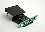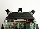 Um mit den unterschiedlichen Sensortypen experimentieren zu können, habe ich diese nicht fest verbaut, sondern mit 3-poligen Stiftleisten versehen. Als Träger für die Sensoren dient eine kleine Platine, die hinten die 8-polige Stiftleiste für den Sensor-Konnektor hat und am unteren Rand drei je 3-polige Buchsen für das Anstecken der Sensoren, die dann am oberen Rand des Trägers mit M2-Schräubchen fixiert werden. Der Träger stützt sich oben und unten jeweils mit einem angeklebten Kunststoffprofil am Roboter-Chassis ab – insgesamt ergibt sich so eine recht stabile Konstruktion. (Diese sah aber nach meiner dilettantischen Kleberei und Löterei so grauenhaft aus, dass ich den Murks mit Flüssigkunststoff kaschiert habe.)