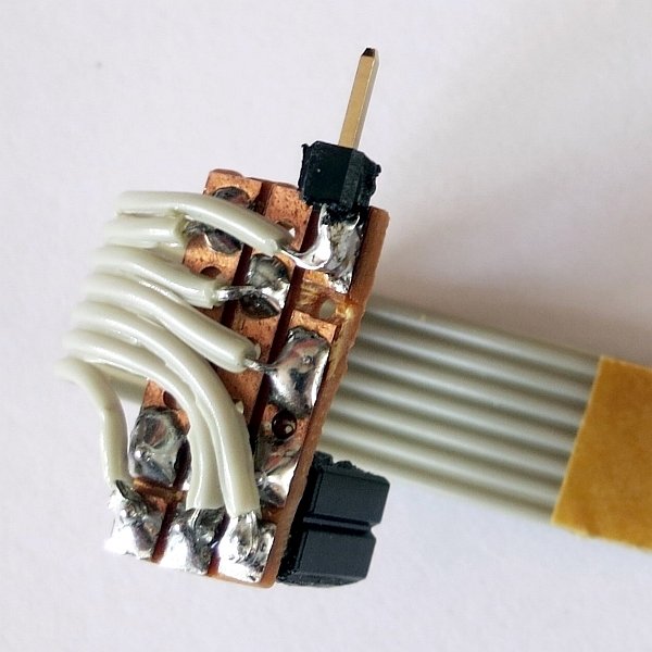 Mit Ausnahme des WLAN-Adapters wird die gesamte Elektronik rund um den Raspberry Pi (Modul für die Motorsteuerung, Start/Stopp-Shutdown-Taster, Sensoren) an den GPIO-Konnektor angeschlossen. Die Modul-Platine belegt mechanisch die Pins 1 – 34, obwohl sie nur wenige davon tatsächlich nutzt. Für die zusätzlichen eigenen Anwendungen (Sensoren, Taster) habe ich daher für die sechs noch zugänglichen Pins am Ende des Konnektors eine passende Steckverbindung basteln und Kabel auf die Modul-Platine auflöten müssen.