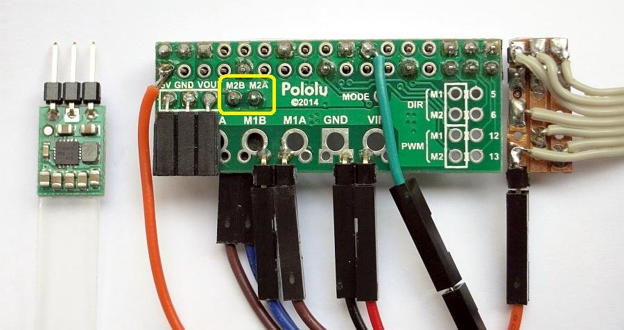 Damit ich das Platinchen mit dem Spannungsregler für den nicht-mobilen Netzteilbetrieb abziehen kann, habe ich es mit einem Steckverbinder an das Pololu-Modul angeschlossen, ein daran befestigter Kunststoffstreifen (links im Bild) dient dabei als Griff. Um den Aufbau über dem Raspberry Pi möglichst flach zu halten, habe ich den Regler horizontal montiert; deshalb konnte ich die Stiftleisten-Paare für die Motoren und die Akkuspannung nur noch wie abgebildet anbringen. Insbesondere die Stecker für den linken Motor passten nur noch unter die Platine (Lötpunkte M2A und M2B, im Foto oben gelb umrandet).